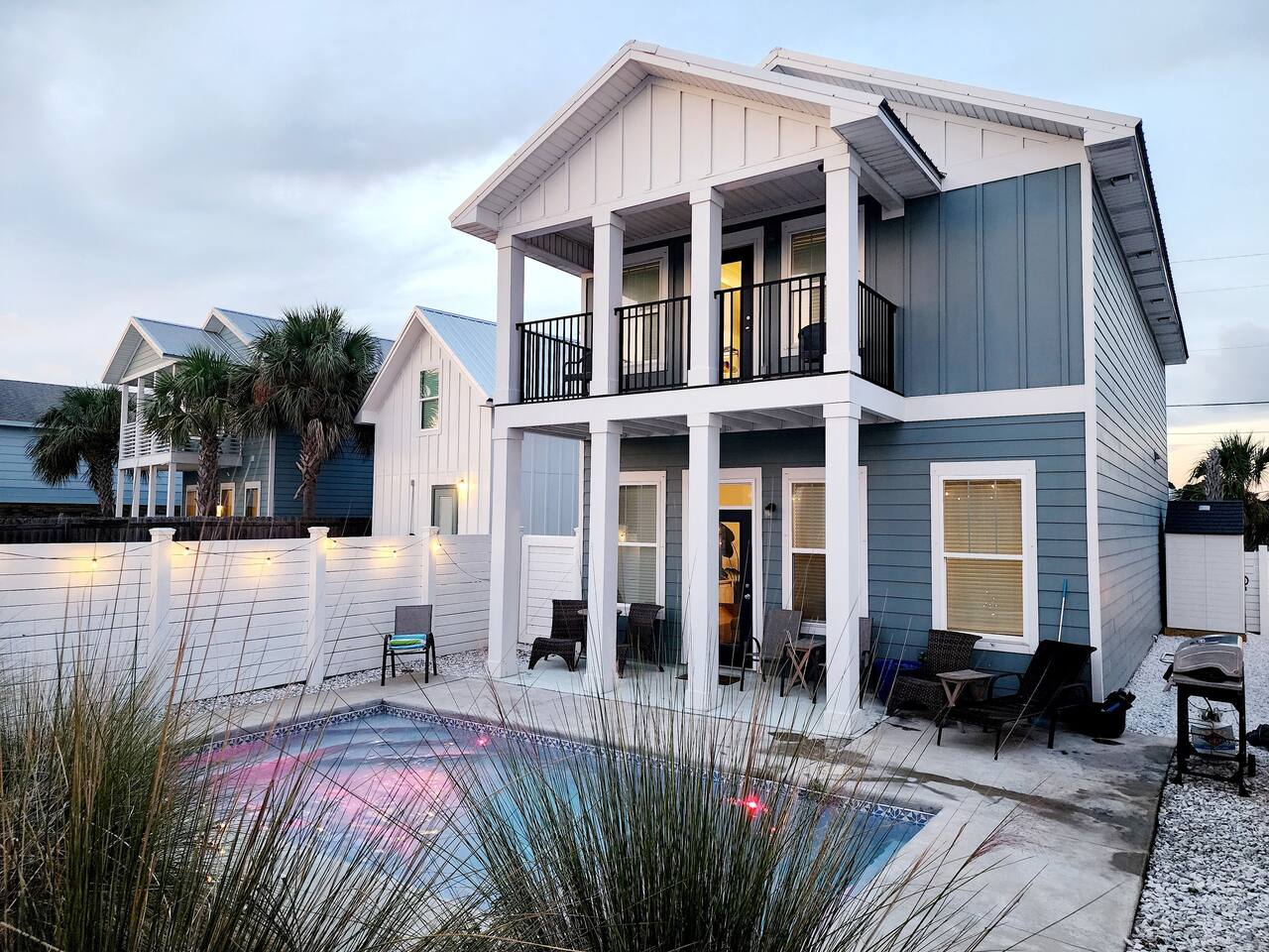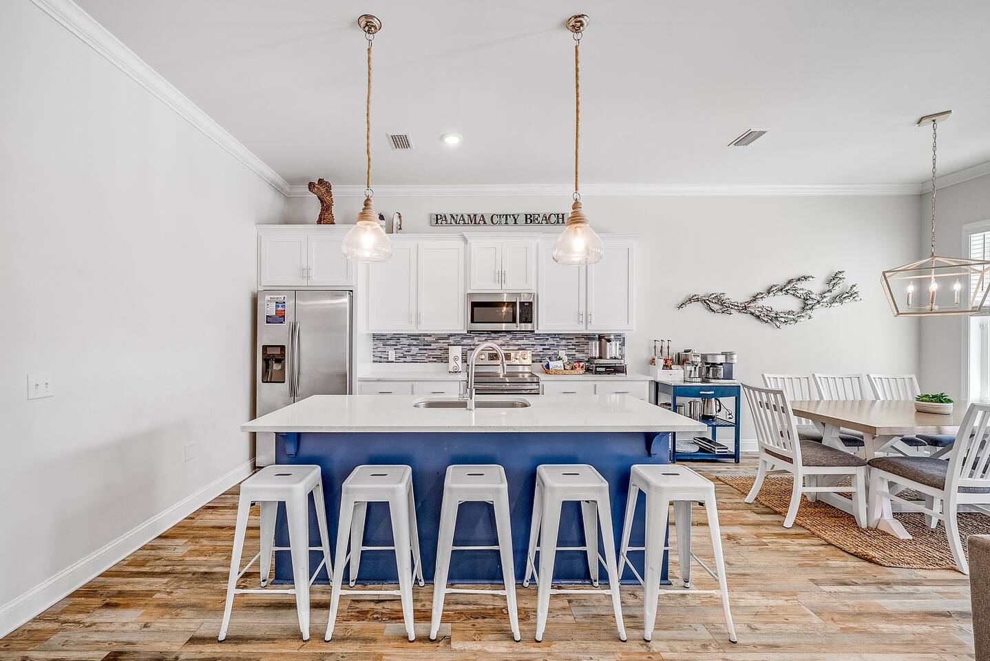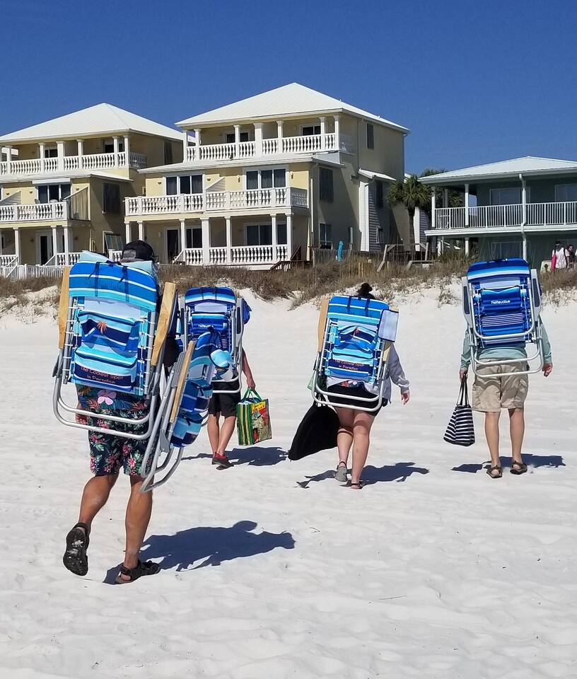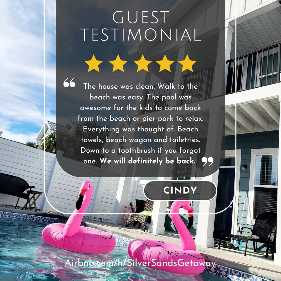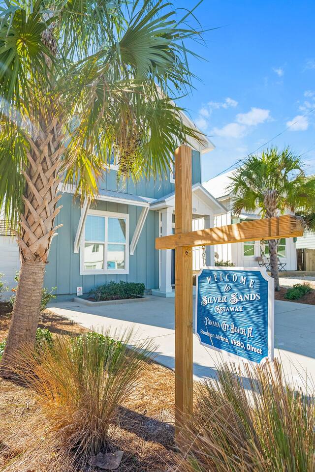 A spacious family beach home designed for relaxation and good times, with a private heated pool, comfy sun loungers, fenced yard with a grill, and lots of little luxuries that make getaways easy and fun for every generation. Our "almost beachfront" location offers a short walk to the beach, giving you all the perks without the premium price. • 10 Guests • 7 Beds • 4 Bedrooms • 3 Bathrooms • 738 Mbps WiFi (fast!) • 12 Dining Seats: 8 at dinner table, 4 at the island • 4 Coffee Options: Espresso, Keurig, French Press, Standard Drip • 4 Remote Workspaces: desks, ergonomic chairs, monitor, keyboard • 3 Adult Bikes • 45+ Board Games: the most in PCB! • 2 Miles to Walmart, near Publix grocery store and local attractions **Minimum age to book is 25. No smoking. No pets.** Silver Sands Getaway is a favorite for families and groups with infants or toddlers, grandparents or multigenerational guests for many reasons: 📌 CONVENIENT LOCATION This family-friendly vacation home is an ideal base for exploring the city and the surrounding Emerald Coast area, including 30A. It is located in a quiet neighborhood in the east end of Panama City Beach (PCB) with easy access to the beach (access #16 & #17), restaurants, coffee, grocery stores, ice cream shops and local attractions (mini golf, go karts, water parks, fishing excursions, Shell Island ferry, water activities, golf cart rentals). Walk over to Alibi Beach Lounge & Grill for live music and the famous pickle shot—a local favorite! Don’t miss Mr. Puff's Hand-Rolled Ice Cream nearby; it's the perfect sweet treat to top off your day.🍦 ⛱️ BEACH & POOL GEAR FOR ALL AGES Helpful beach wagon to transport your beach-day gear. Comfortable backpack beach chairs, beach towels, cooler, beach umbrellas, sand toys, body boards and pool floats supplied, plus baby swim gear like floats and vests. The private heated pool with its magical color-changing lights is cleaned and serviced 2x per week. No charge for pool heater. 👶 FAMILY-FRIENDLY AMENITIES Traveling with children? Silver Sands Getaway is stocked with thoughtful touches and lots of toys to make trips smoother, safer and much more fun. • Baby & Kid Gear: Toys and books galore! Mini crib, Pack-n-Play with mattress + sheets, highchair, baby gate, baby bathtub, outlet covers, baby monitor, toddler utensils and dinnerware • Beach-ready: Baby float, toddler vest, sand toys and beach wagon for easy carrying • Entertainment: 40+ board games for all ages, from Candy Land, Uno, Yahtzee and Dominoes to strategy games for teens and adults • Bunk Room: Two sturdy sets of twin bunks – kids love this space! • Fenced Yard & Pool: Safe outdoor space for playtime with pool gate alarm and color-changing lights for evening swims • Flexible Sleep & Work Options: Bedrooms on both floors and portable workstations for balancing family time and remote work. 🖥️🌴 REMOTE-WORK READY This home is a great fit for digital nomads, meeting the needs of even the most demanding remote work situations and providing a comfortable and productive work-from-the-beach experience. • Fast and reliable Wi-Fi for remote work. • 4 dedicated workstations equipped with desk, ergonomic chair, large monitor, keyboard and mouse. • Alternate workspaces — like the living room, dining room or patio — offer a refreshing change of scenery and allow multiple people to work at the same time. • The green wall in master bedroom provides an excellent video conferencing backdrop. 🧼 STOCKED FOR YOUR CONVENIENCE Starter pack of supplies is provided (toilet paper, paper towels, trash bags, Keurig pods, dishwasher detergent, dish soap, shampoo, conditioner, soap, etc.). You may need to bring or buy additional supplies based on the length of your stay. 💎 LITTLE LUXURIES • 2 Coffee Bars: one in the downstairs main living area and another in the upstairs master suite • 3 Adult Bikes. Let us know prior to your visit that you would like to use these. • Propane Grill: free propane • Bartesian cocktail maker, with sample pods • 40+ Family Board Games for all ages (Yahtzee, Jenga, Sorry, Life, Dominoes, Mancala and many more!) • Exercise equipment: Free weights, yoga mat • Safe for valuables • 1 bedroom and 1 bathroom located on first floor • Laundry Room: Washer, Dryer, Iron, Ironing Board • 1-min walk to Tom Thumb convenience store. Beach Liquors & Ms. Newby’s offer alcohol delivery—Ms. Newby’s also has a drive-through (4-min drive). 🍽️ KITCHEN Many excellent nearby restaurants deliver or offer take-out, but for those wanting to cook, the fully loaded kitchen is well-equipped: • Dishes (plates, bowls, serving platters) • Glassware (wine, champagne and margarita glasses) • Plastic drinkware for by the pool • Utensils • Pots and pans • Electric stand mixer • Crockpot • Blender • Rice cooker • Waffle maker • Bread maker • Appliances and cooking essentials. For those who love baking, the kitchen is stocked with pie plates, muffin tins, cake and bread pans, cooling racks, and more—everything needed to whip up blueberry muffins or a birthday cake. ☕ Start your day with a perfect cup of coffee or tea. Choose from the espresso machine, French Press or the Keurig Duo, with complimentary K-Cups provided. You'll also find a selection of tea, sugar, sweeteners and creamer to make your morning just the way you like it. 🍸 Unwind with a craft cocktail at the push of a button! Our Bartesian cocktail maker lets you mix bar-quality drinks effortlessly—just insert a capsule, add your own alcohol, and enjoy. We’ve provided a selection of sample capsules so you can sip and relax in style. 🛏️ BEDROOMS Each of the 4 bedrooms features high-quality linens, multiple pillows, Roku-enabled smart TVs and portable workstations. • Bedroom 1 - Downstairs: Queen bed with 14-inch mattress and 50-inch Roku TV. This first-floor room is great for seniors or guests who 