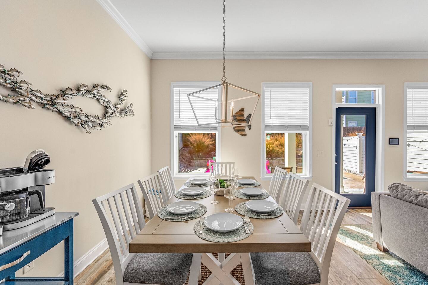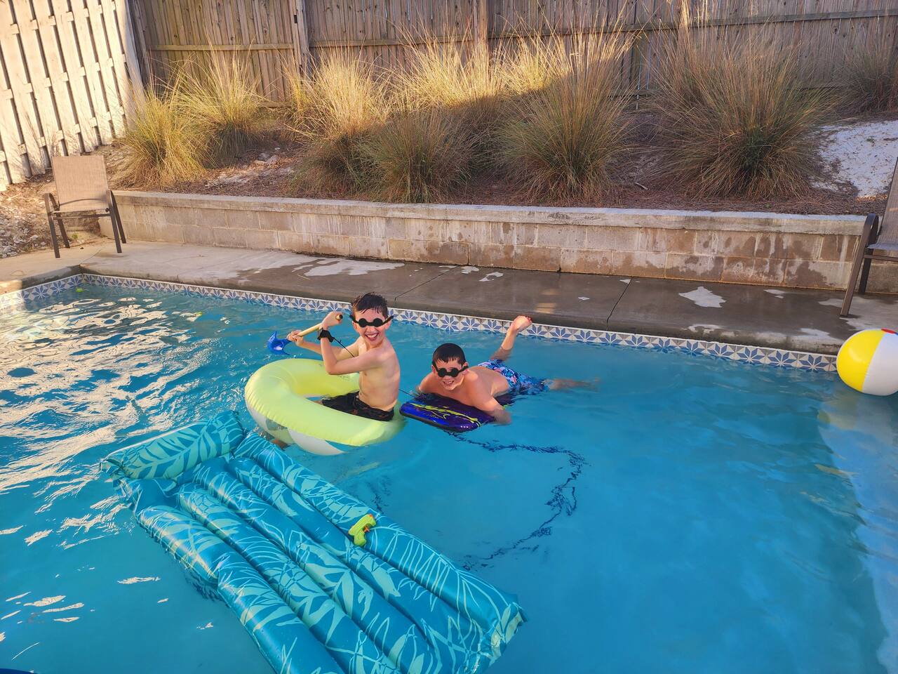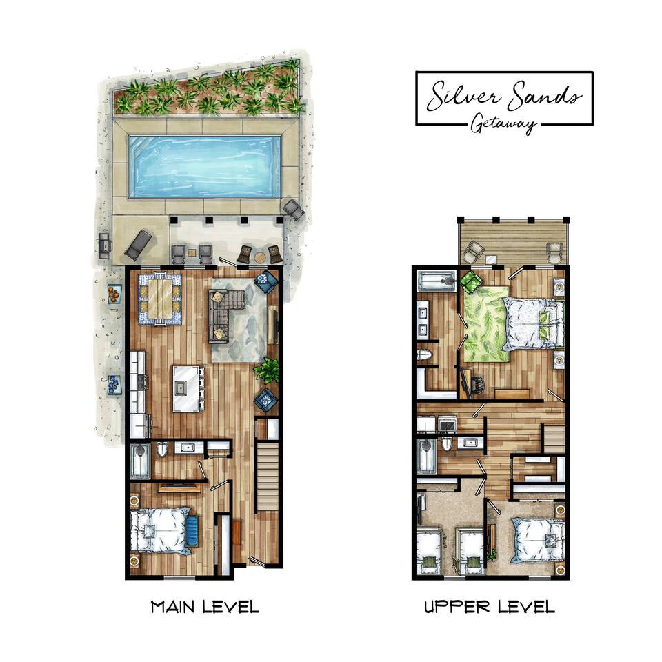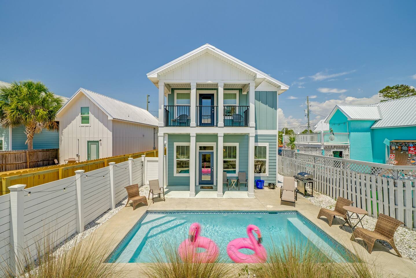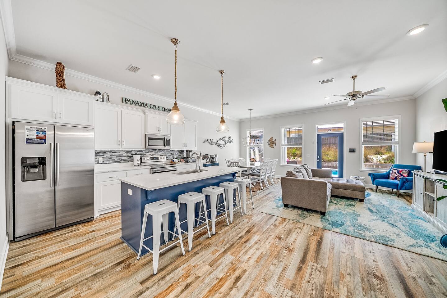 A spacious family beach home designed for relaxation and good times, with a private heated pool, comfy sun loungers, fenced yard with a grill, and lots of little luxuries that make getaways easy and fun for every generation. Our "almost beachfront" location offers a short walk to the beach, giving you all the perks without the premium price. • 10 Guests • 7 Beds • 4 Bedrooms • 3 Bathrooms • 738 Mbps WiFi (fast!) • 12 Dining Seats: 8 at dinner table, 4 at the island • 4 Coffee Options: Espresso, Keurig, French Press, Standard Drip • 4 Remote Workspaces: desks, ergonomic chairs, monitor, keyboard • 3 Adult Bikes • 45+ Board Games: the most in PCB! • 2 Miles to Walmart, near Publix grocery store and local attractions **Minimum age to book is 25. No smoking. No pets.** Silver Sands Getaway is a favorite for families and groups with infants or toddlers, grandparents or multigenerational guests for many reasons: 📌 CONVENIENT LOCATION This family-friendly vacation home is an ideal base for exploring the city and the surrounding Emerald Coast area, including 30A. It is located in a quiet neighborhood in the east end of Panama City Beach (PCB) with easy access to the beach (access #16 & #17), restaurants, coffee, grocery stores, ice cream shops and local attractions (mini golf, go karts, water parks, fishing excursions, Shell Island ferry, water activities, golf cart rentals). Walk over to Alibi Beach Lounge & Grill for live music and the famous pickle shot—a local favorite! Don’t miss Mr. Puff's Hand-Rolled Ice Cream nearby; it's the perfect sweet treat to top off your day.🍦 ⛱️ BEACH & POOL GEAR FOR ALL AGES Helpful beach wagon to transport your beach-day gear. Comfortable backpack beach chairs, beach towels, cooler, beach umbrellas, sand toys, body boards and pool floats supplied, plus baby swim gear like floats and vests. The private heated pool with its magical color-changing lights is cleaned and serviced 2x per week. No charge for pool heater. 👶 FAMILY-FRIENDLY AMENITIES Traveling with children? Silver Sands Getaway is stocked with thoughtful touches and lots of toys to make trips smoother, safer and much more fun. • Baby & Kid Gear: Toys and books galore! Mini crib, Pack-n-Play with mattress + sheets, highchair, baby gate, baby bathtub, outlet covers, baby monitor, toddler utensils and dinnerware • Beach-ready: Baby float, toddler vest, sand toys and beach wagon for easy carrying • Entertainment: 40+ board games for all ages, from Candy Land, Uno, Yahtzee and Dominoes to strategy games for teens and adults • Bunk Room: Two sturdy sets of twin bunks – kids love this space! • Fenced Yard & Pool: Safe outdoor space for playtime with pool gate alarm and color-changing lights for evening swims • Flexible Sleep & Work Options: Bedrooms on both floors and portable workstations for balancing family time and remote work. 🖥️🌴 REMOTE-WORK READY This home is a great fit for digital nomads, meeting the needs of even the most demanding remote work situations and providing a comfortable and productive work-from-the-beach experience. • Fast and reliable Wi-Fi for remote work. • 4 dedicated workstations equipped with desk, ergonomic chair, large monitor, keyboard and mouse. • Alternate workspaces — like the living room, dining room or patio — offer a refreshing change of scenery and allow multiple people to work at the same time. • The green wall in master bedroom provides an excellent video conferencing backdrop. 🧼 STOCKED FOR YOUR CONVENIENCE Starter pack of supplies is provided (toilet paper, paper towels, trash bags, Keurig pods, dishwasher detergent, dish soap, shampoo, conditioner, soap, etc.). You may need to bring or buy additional supplies based on the length of your stay. 💎 LITTLE LUXURIES • 2 Coffee Bars: one in the downstairs main living area and another in the upstairs master suite • 3 Adult Bikes. Let us know prior to your visit that you would like to use these. • Propane Grill: free propane • Bartesian cocktail maker, with sample pods • 40+ Family Board Games for all ages (Yahtzee, Jenga, Sorry, Life, Dominoes, Mancala and many more!) • Exercise equipment: Free weights, yoga mat • Safe for valuables • 1 bedroom and 1 bathroom located on first floor • Laundry Room: Washer, Dryer, Iron, Ironing Board • 1-min walk to Tom Thumb convenience store. Beach Liquors & Ms. Newby’s offer alcohol delivery—Ms. Newby’s also has a drive-through (4-min drive). 🍽️ KITCHEN Many excellent nearby restaurants deliver or offer take-out, but for those wanting to cook, the fully loaded kitchen is well-equipped: • Dishes (plates, bowls, serving platters) • Glassware (wine, champagne and margarita glasses) • Plastic drinkware for by the pool • Utensils • Pots and pans • Electric stand mixer • Crockpot • Blender • Rice cooker • Waffle maker • Bread maker • Appliances and cooking essentials. For those who love baking, the kitchen is stocked with pie plates, muffin tins, cake and bread pans, cooling racks, and more—everything needed to whip up blueberry muffins or a birthday cake. ☕ Start your day with a perfect cup of coffee or tea. Choose from the espresso machine, French Press or the Keurig Duo, with complimentary K-Cups provided. You'll also find a selection of tea, sugar, sweeteners and creamer to make your morning just the way you like it. 🍸 Unwind with a craft cocktail at the push of a button! Our Bartesian cocktail maker lets you mix bar-quality drinks effortlessly—just insert a capsule, add your own alcohol, and enjoy. We’ve provided a selection of sample capsules so you can sip and relax in style. 🛏️ BEDROOMS Each of the 4 bedrooms features high-quality linens, multiple pillows, Roku-enabled smart TVs and portable workstations. • Bedroom 1 - Downstairs: Queen bed with 14-inch mattress and 50-inch Roku TV. This first-floor room is great for seniors or guests who 
